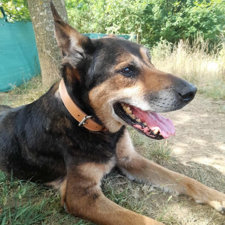 He has at one time lost part of his tongue and a few teeth, along with the fur on his back (which is beginning to grow back). Being part shepherd and a large boy his joints are failing him, so he is on pain medication to ease his pain, but still loves a potter in the field and a walk down the drive to investigate new smells.